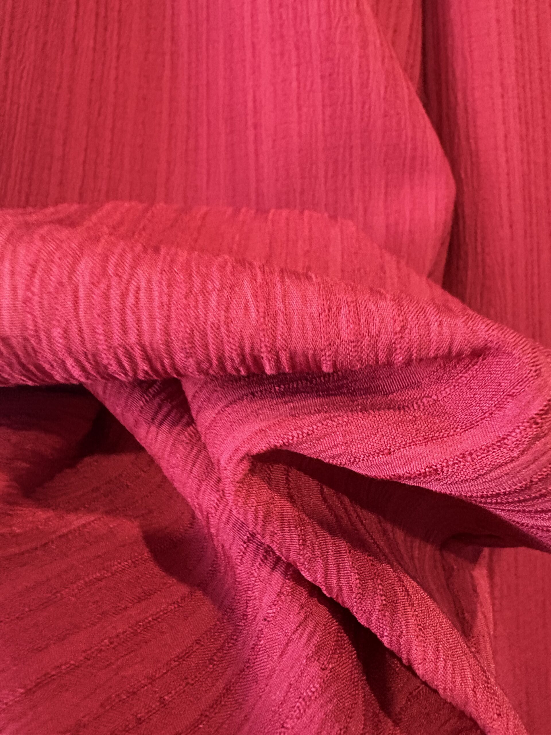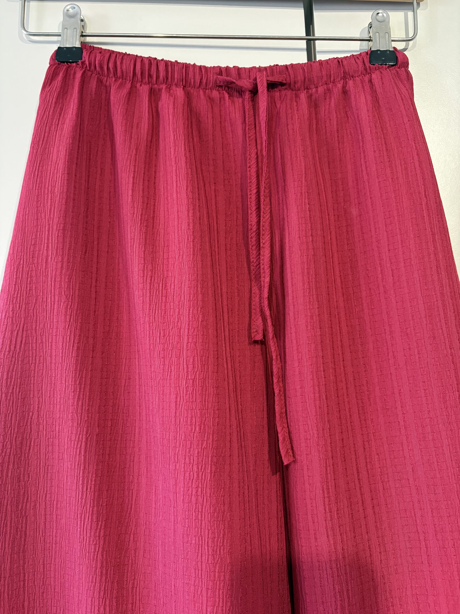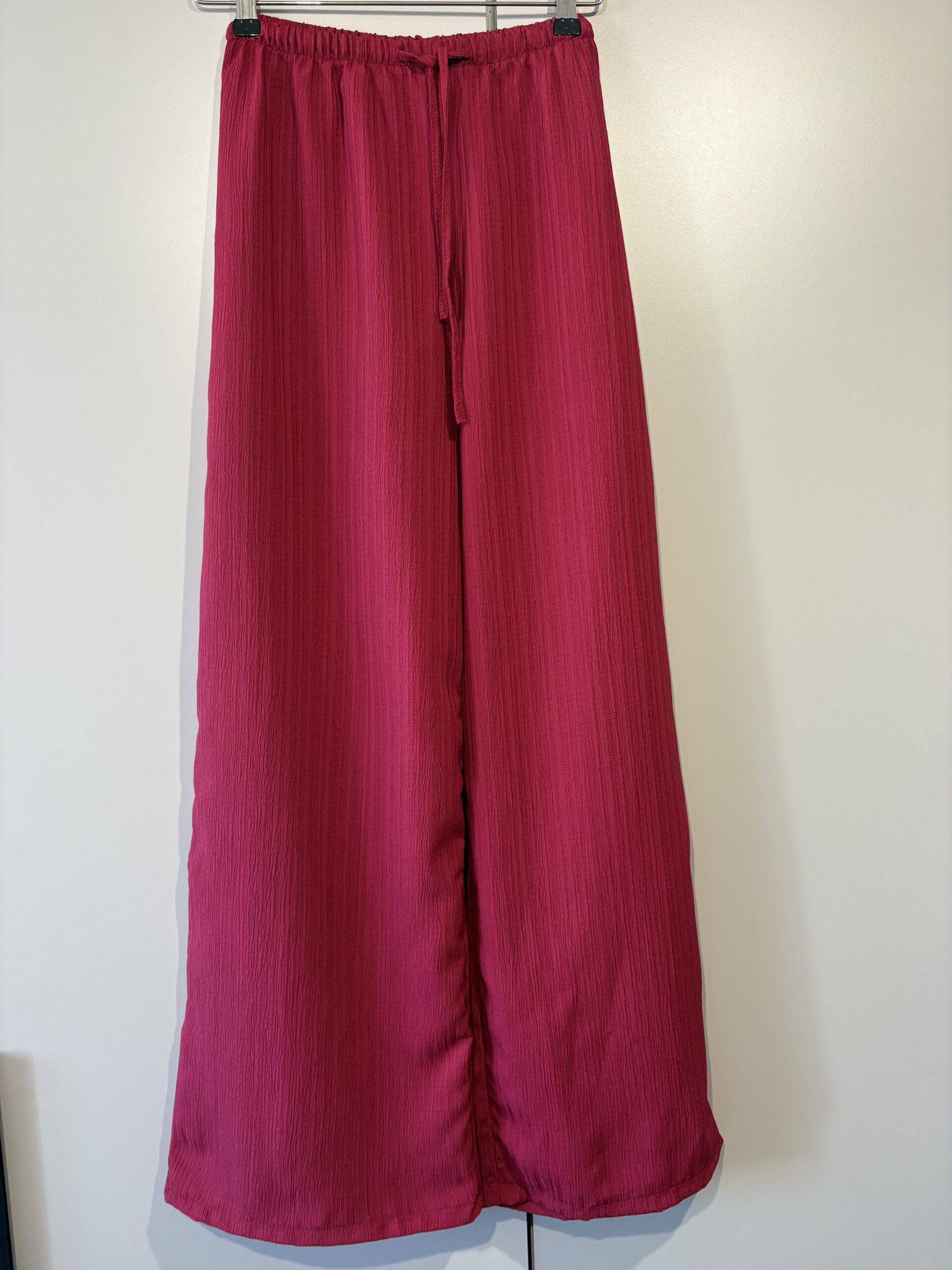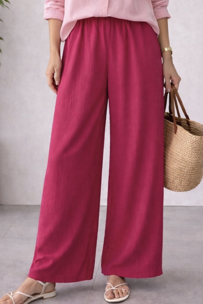 Szerokie spodnie palazzo w soczystym malinowym odcieniu, które pięknie wydłużają sylwetkę i nadają stylizacji lekkości. Miękko układający się materiał i elastyczny pas z troczkiem zapewniają wygodę przez cały dzień, a elegancki charakter sprawia, że sprawdzą się zarówno na co dzień, jak i do bardziej dopracowanych stylizacji.