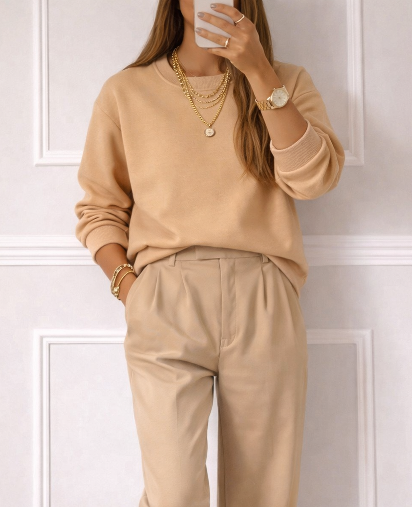 Beżowa bluza świetnie komponuje się z jasnymi spodniami, denimem oraz klasycznymi dodatkami, tworząc spójny i elegancki look na co dzień.