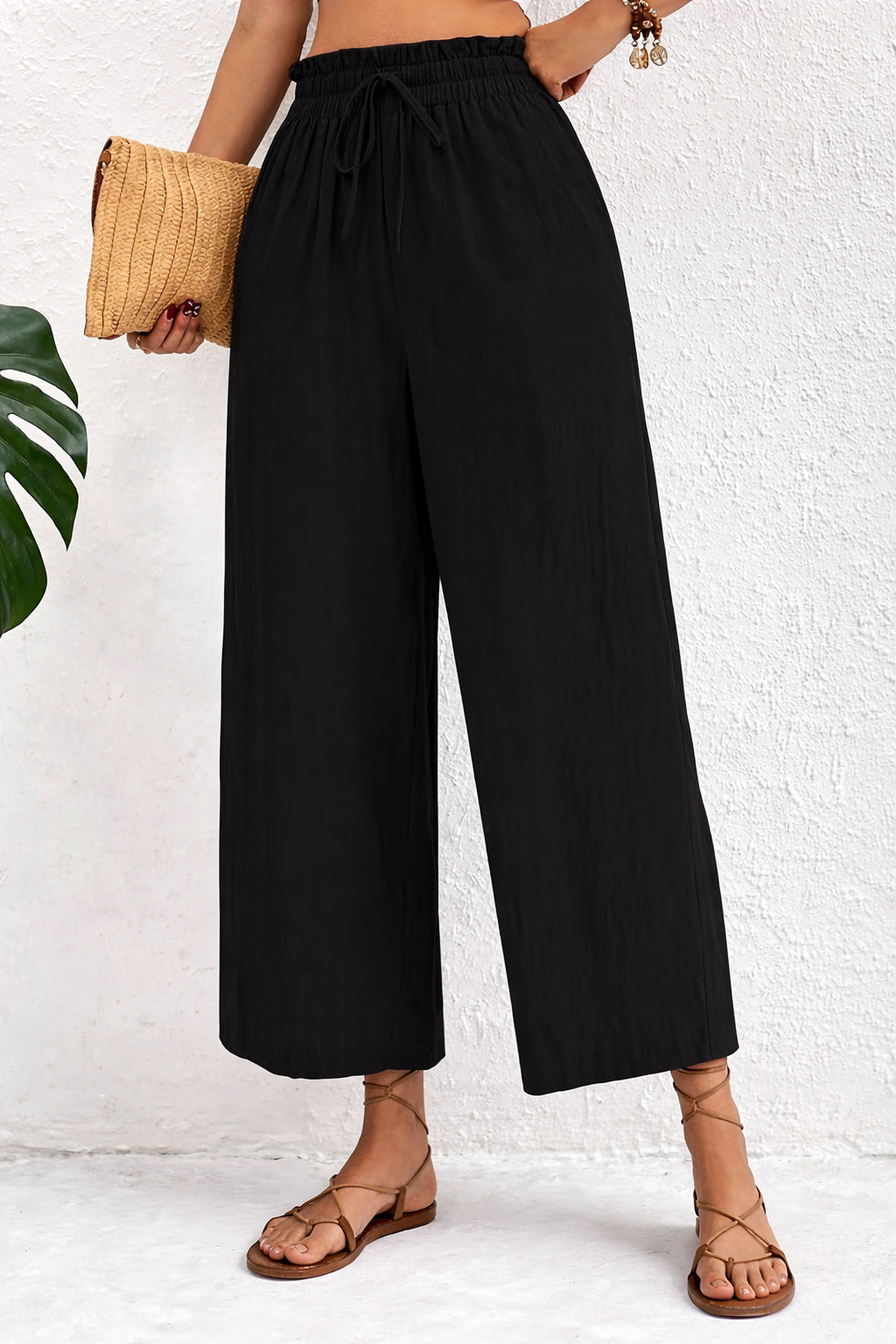 Mięsista bawełna, wygodny elastyczny pas i szeroka nogawka, która pięknie układa się na sylwetce.