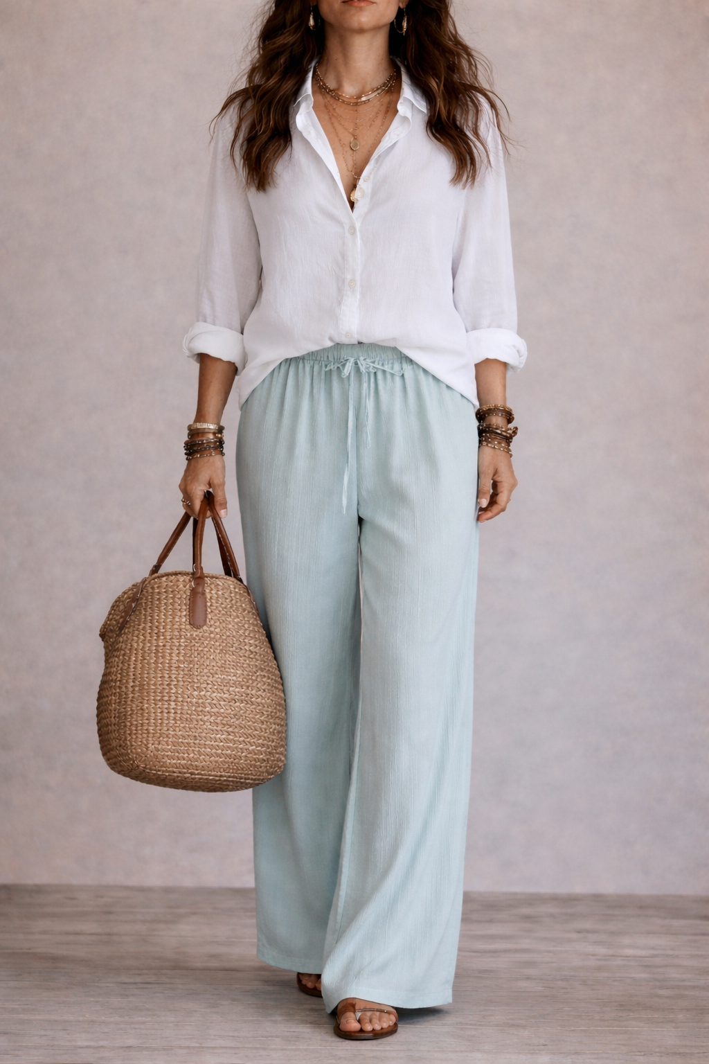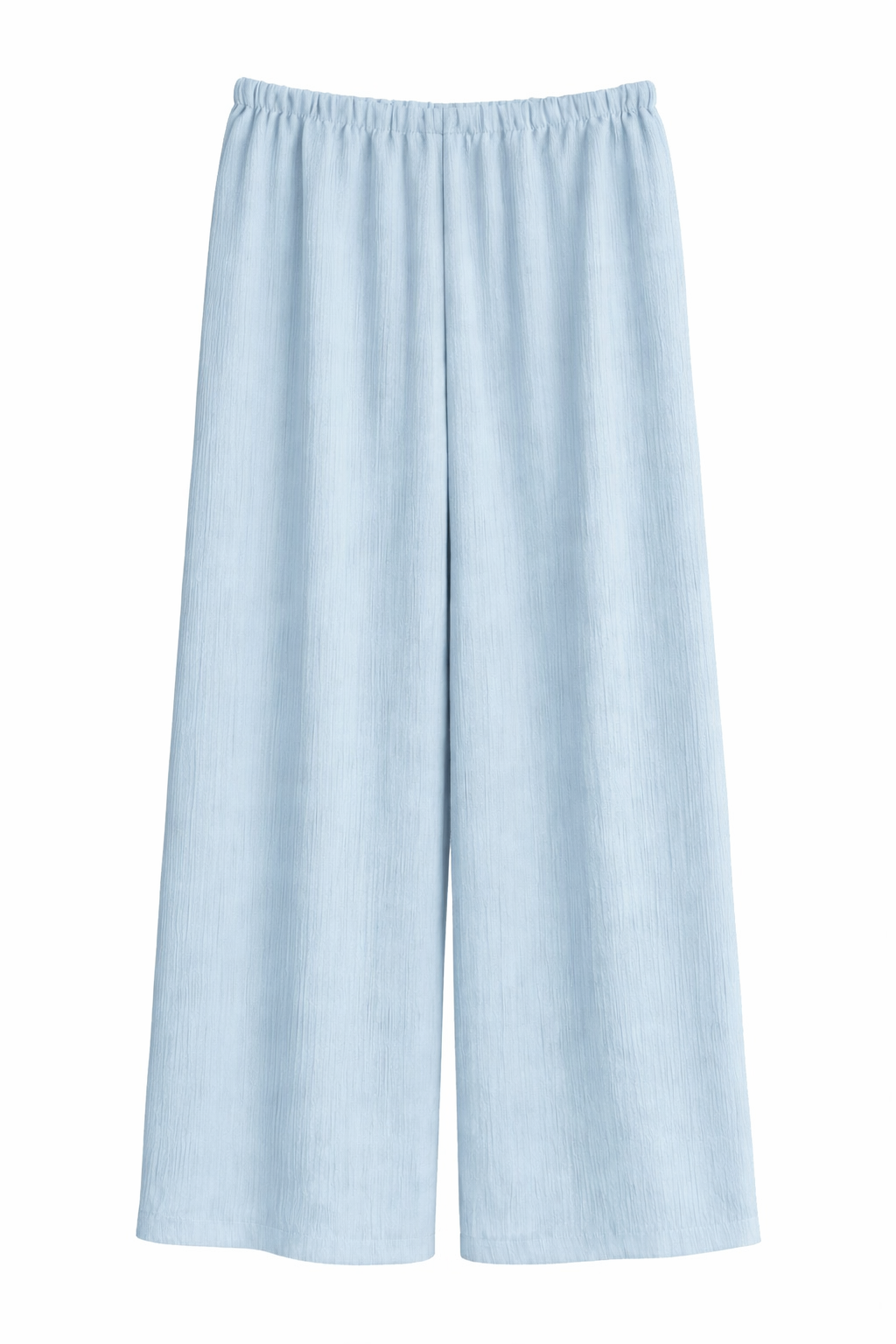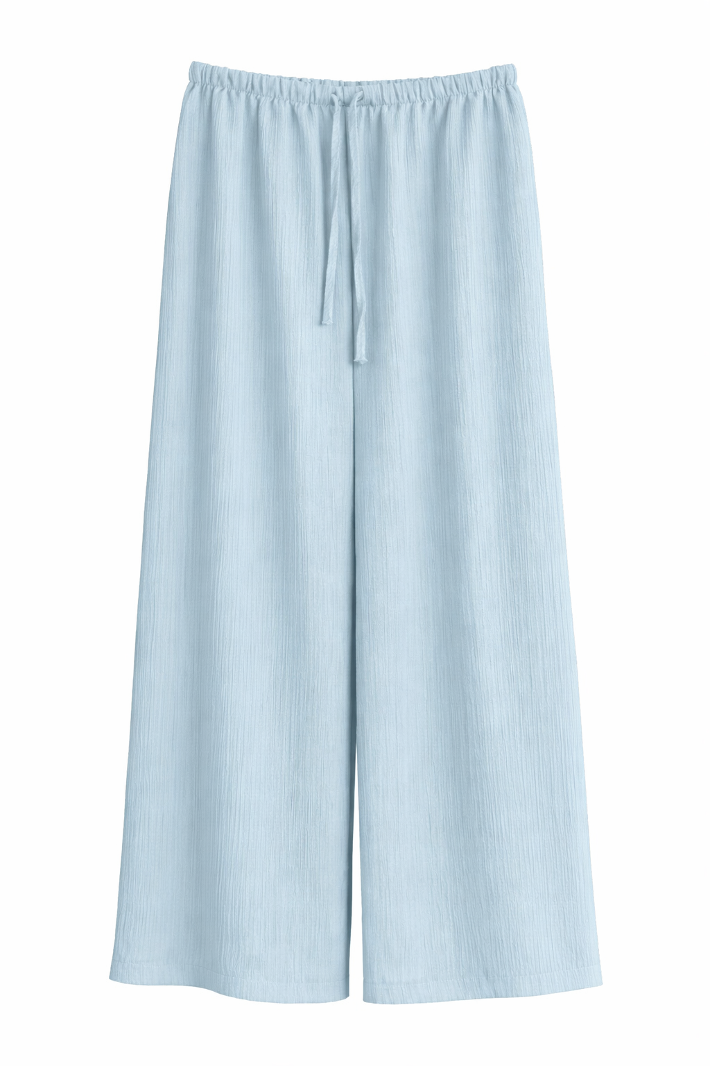 Szerokie spodnie palazzo w niebieskim jasnym odcieniu, które pięknie wydłużają sylwetkę i nadają stylizacji lekkości. Miękko układający się materiał i elastyczny pas z troczkiem zapewniają wygodę przez cały dzień, a elegancki charakter sprawia, że sprawdzą się zarówno na co dzień, jak i do bardziej dopracowanych stylizacji.